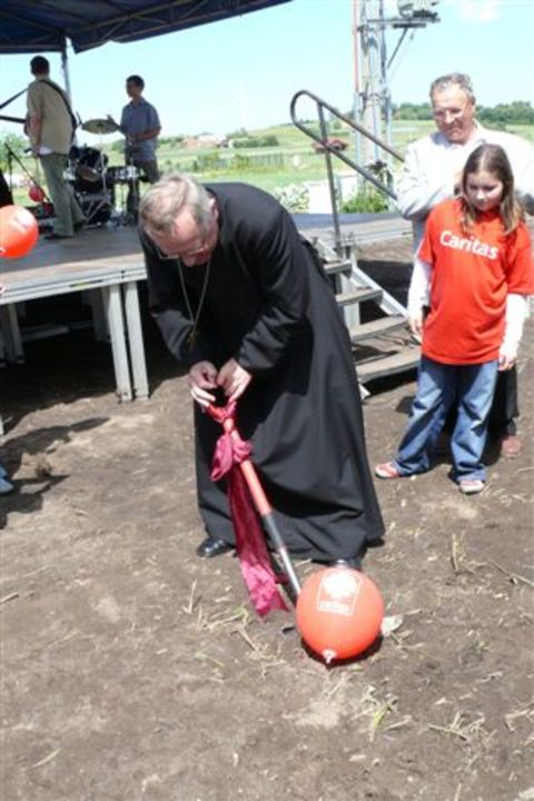Symbolicznym momentem rozpoczęcia prac było wbicie łopat w ziemię. Wspólnie dokonali tego: Biskup Edward Dajczak, dyrektor Caritas Diecezji ks. Piotr Popławski, zastępca dyrektora Caritas Diecezji ks. Rafał Stasiejko, proboszcz parafii kościoła p.w. Św. Gertrudy Eugeniusz Gnibba oraz przedstawiciel komitetu budowy Leszek Dydyna.