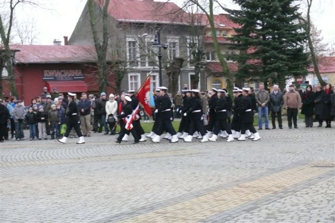 Po mszy poczty sztandarowe, kompania honorowa Marynarki Wojennej oraz po raz pierwszy kompania honorowa Zespołu Szkół Morskich, Straż Graniczna, władze samorządowe miasta i powiatu, kombatanci, delegacje, harcerze i mieszkańcy przy dźwiękach orkiestry dętej przemaszerowali z kościoła na plac Marszałka Józefa Piłsudskiego gdzie odbyła się patriotyczna uroczystość. Uświetnili ją m.in. starosta powiatu sławieńskiego -Andrzej Lewandowski, burmistrz miasta Darłowo Arkadiusz Klimowicz, dowódcy jednostek wojskowych i służb mundurowych oraz radni. Mieszkańcy i młodzież wysłuchali wystąpienia starosty sławieńskiego Andrzeja Lewandowskiego, który przypomniał trudną drogę do odzyskania niepodległości.
