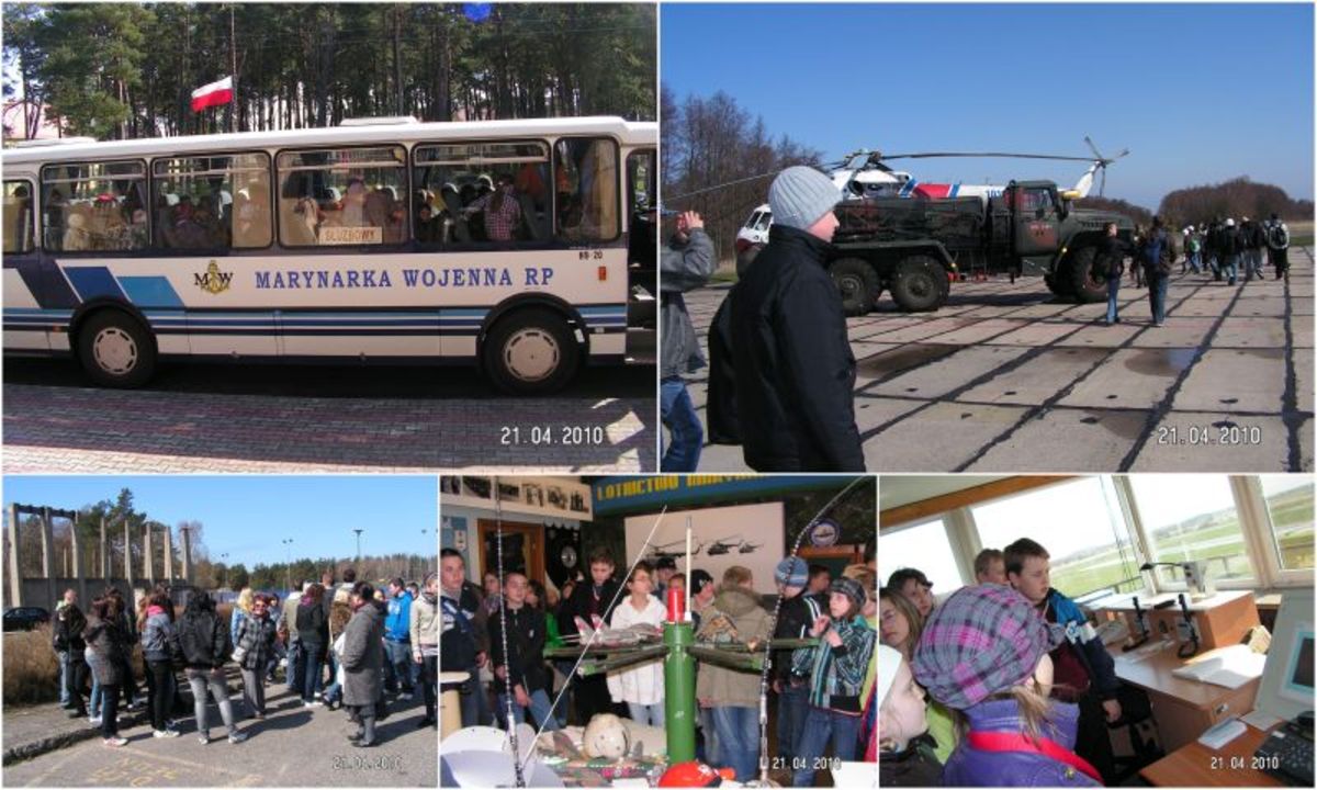 Dnia 21.04.2010 roku uczniowie naszej Szkoły odwiedzili 29 „Darłowską" Eskadrę Lotniczą w Darłówku. Chcieliśmy bliżej poznać codzienną pracę żołnierzy, zarówno lotników i ratowników, jak i ludzi zajmujących się obsługą śmigłowców. Uczniowie podzieleni na grupy wiekowe zwiedzali m.in. śmigłowce, wieżę kontroli lotów, Salę Tradycji w Klubie Garnizonowym. Dużym zainteresowaniem cieszyła się Sala Tradycji, w której oprócz kronik i tablic ze zdjęciami kolejnych dowódców jednostek, znajdują się modele śmigłowców i inne ciekawe eksponaty związane z lotnictwem morskim. Są tam też kombinezony ratownika morskiego oraz lotnika, elementy wyposażenia technika pokładowego oraz wiele innych przedmiotów, które związane są ze służbą ratowniczą. Uczniowie mogli również zobaczyć aparat fotograficzny z początków XX wieku. Kolejnym punktem zwiedzania był port lotniczy. Tam z bliska mogliśmy obejrzeć śmigłowiec, zobaczyć, jaki jest duży, dowiedzieć się ile waży i ile spala paliwa. Żołnierze ratownicy opowiedzieli o swojej trudnej i niebezpiecznej pracy. Następnie przeszliśmy do wojskowego portu lotniczego zwanego potocznie wieżą kontroli lotów. Tam, obsada stacji meteorologicznej przedstawiła nam prognozę pogody na najbliższe dni oraz opowiedziała o swojej pracy. W punkcie kontrolnym, na monitorach komputerów, mogliśmy śledzić tory lotów w korytarzach powietrznych.