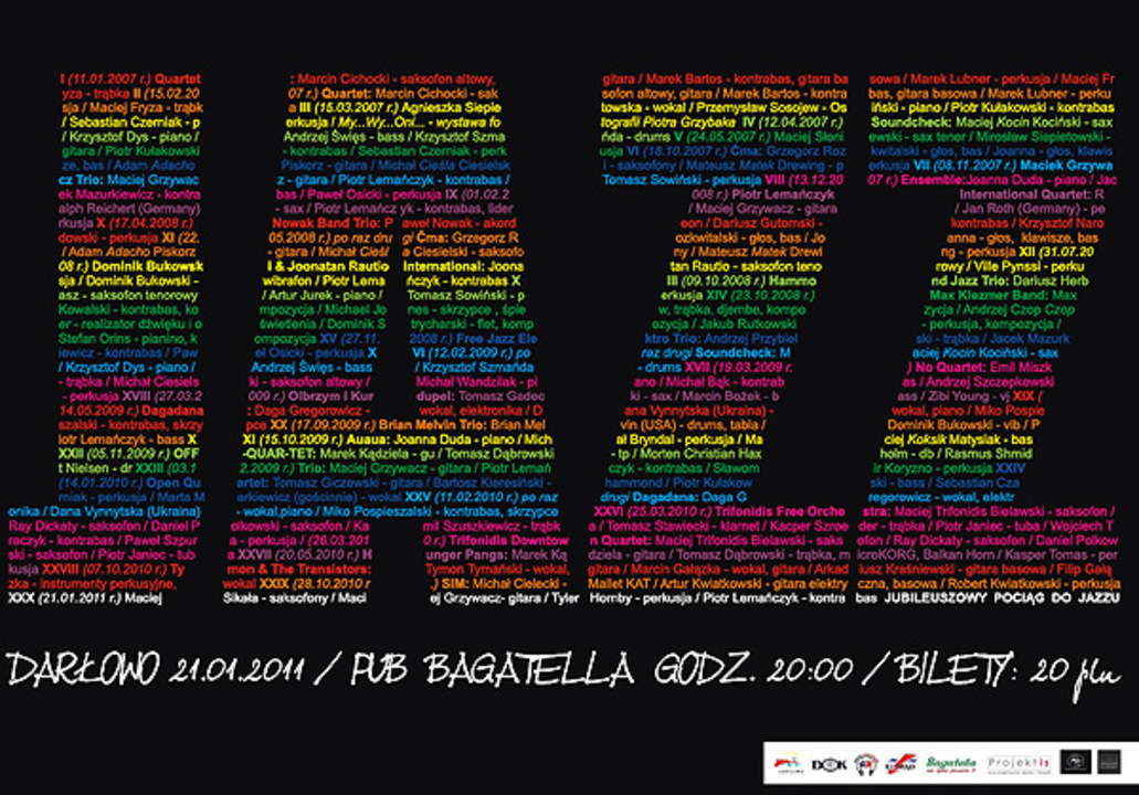 W styczniu mija czwarty rok trwania inicjatywy pod nazwa Czwartkowy Pociąg do Jazzu. Zaczęło się od koncertu 11 stycznia 2007 roku, kiedy czwórka darłowskich muzyków - Maciek Fryza, Marek Lubner, Marcin Cichocki oraz Marek Bartos pierwszymi dźwiękami w piwnicy Pubu Bagatella powołali do życia cykl jazzowych koncertów. Ruszył „Pociąg do Jazzu". Kolejne koncerty jak doczepiane „wagony" prezentowały coraz to nowe składy muzyków i gościły podróżujących słuchaczy. Przez 4 lata odbyło się 29 koncertów z czego 6 to grupy międzynarodowe, w których grali muzycy z różnych zakątków europy jak również ameryki. O tym, że grają jazz w Darłowie jest już głośno, mówiono o tym m.in. w Drugim Programie Polskiego Radia. Wieść tą szerzą muzycy odwiedzający piwnice Bagatelli jak również ludzie, którzy czasem przyjeżdżają z okolicznych miast na koncerty. Klimat CZ.P.d.J. tworzą przede wszystkim słuchacze, w następnej kolejności muzycy oraz miejsce, które niewątpliwie się przyjęło. Pub Bagatella udostępnia Pan Dariusz Kos, który pomaga w organizacji koncertów, a także zapowiada grające zespoły.