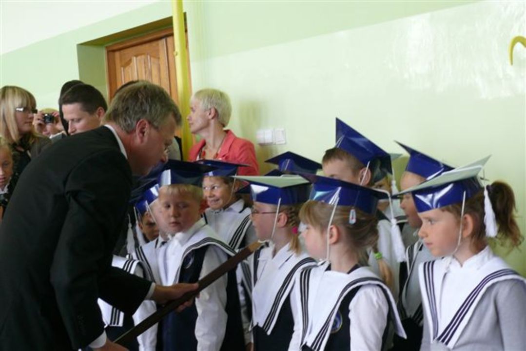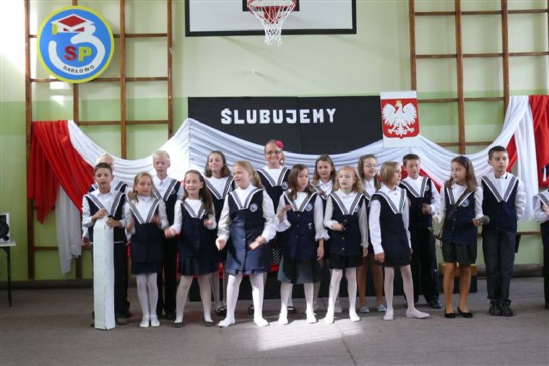 Na sztandar szkoły ślubowały dzieci z klas pierwszych: ,,Ślubuję być dobrym Polakiem, dbać o dobre imię swojej klasy i szkoły. Będę uczyć się w szkole jak kochać Ojczyznę, jak dla niej pracować, kiedy urosnę. Będę starał się być dobrym kolegą, swym zachowaniem i nauką sprawiać radość rodzicom i nauczycielom". Po ślubowaniu pierwszaków dyrektor Szkoły Andrzej Protasewicz i burmistrz miasta zgodnie z tradycją pasowali za pomocą długich ołówków uczniów klas pierwszych. Wszystkim uczniom, a szczególnie pierwszoklasistom życzymy wielu sukcesów w nauce i dobrego samopoczucia w naszej szkole przez najbliższe 6 lat mówił w swoim wystąpieniu dyrektor.