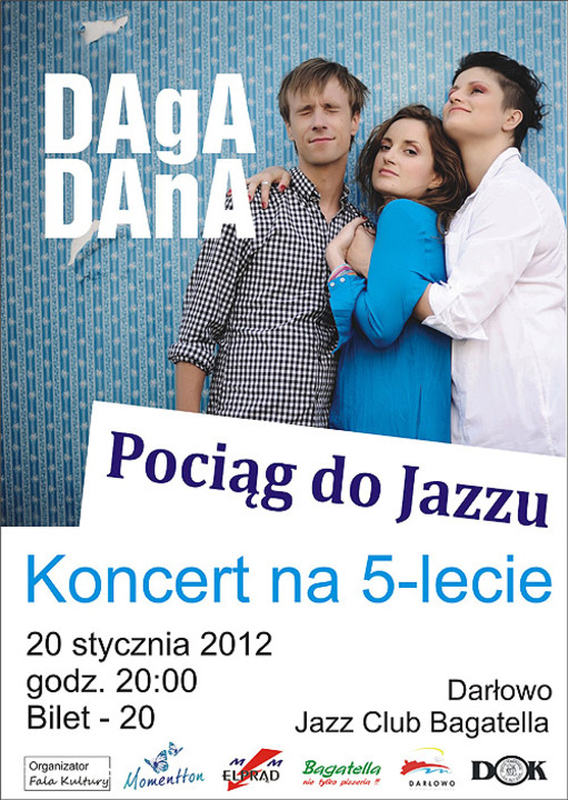 Serdecznie zapraszamy na koncert z okazji 5-lecia Pociągu do Jazzu. To już kawał koncertowej historii jazzu w Darłowie. Wszyscy, który chcą uczcić ten fakt powinni zarezerwować sobie piątkowy wieczór i nastawić się na wyjątkowy koncert. Na deskach Jazz Clubu Bagatella znany i lubiany zespół Dagadana. Dla Dagi Gregorowicz, Dany Vynnytskiej i Mikołaja Pospieszalskiego nie ma granic, ani w muzyce, ani w podróży. Chwilę po wydaniu znakomitego albumu „Dlaczego nie" i po świetnie przyjętym występie przed formacją Tinariwen, zwycięzcy Fryderyków 2011 w kategorii Album Roku Folk / Muzyka Świata, polsko-ukraińskie trio DAGADANA rusza w trasę koncertową, na której znalazło się Darłowo.
