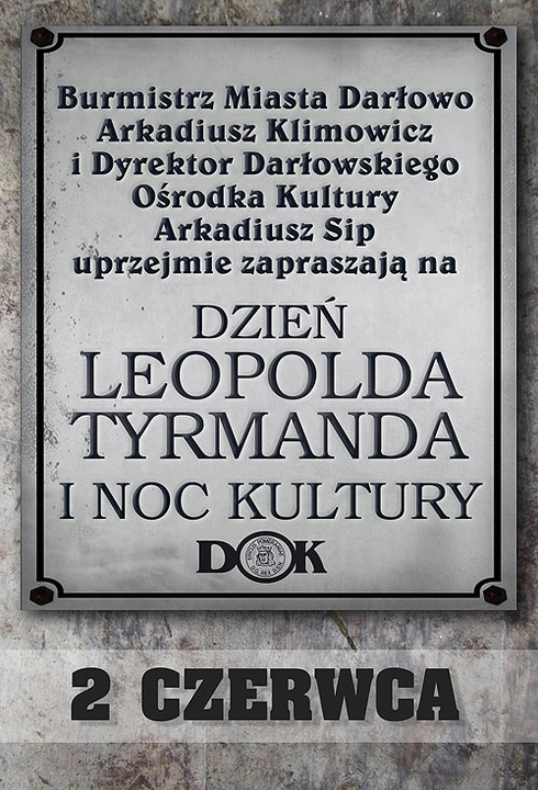 Burmistrz Darłowa Arkadiusz Klimowicz i Dyrektor Darłowskiego Ośrodka Kultury Arkadiusz Sip serdecznie zapraszają na: Dzień Leopolda Tyrmanda i Noc Kultury - 2 czerwca 2012 - Darłowo.