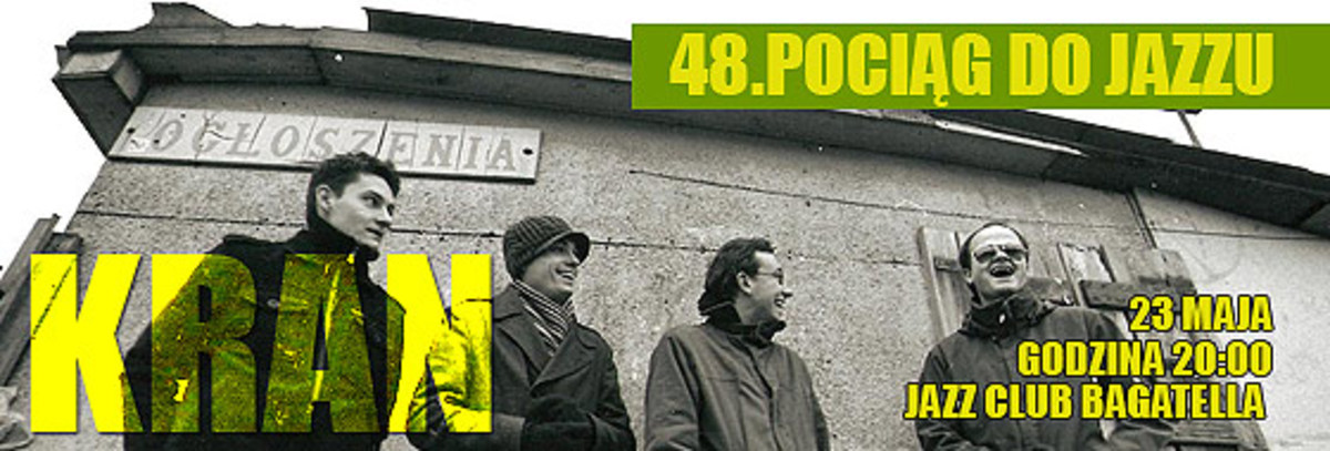 Zapraszamy na ostatni koncert przed letnią przerwą, zagra dla was zespół KRAN. To wspaniali muzycy, którzy zaprezentują światowy poziom wykonawczy. Ostatnie koncerty "pociągu" to głównie składy w Trio, tym razem wystąpi quartet - zapewniając nieco inną muzyczną przestrzeń. Kran to międzynarodowy kwartet jazzowy prezentujący własne kompozycje. Zespół powstał w 2007 roku w duńskim Odense, gdzie muzycy spotkali się na prestiżowej uczelni Carla Nielsena, od tego czasu regularnie koncertują w tym składzie. Muzyka wykonywana przez zespół to jazz nowoczesny, na którego brzmienie składa się indywidualizm każdego z muzyków. Bardzo nowatorska melodyka, energia, mająca źródła w niezwykle bogatej historii jazzu polskiego oraz skandynawskiego. Wśród bardzo żywiołowych i karkołomnych utworów nie brakuje też lirycznych kompozycji. Zespół już od swojego powstania czynnie brał udział w muzycznym życiu Polski, Danii (skąd pochodzą jego członkowie) oraz Niemiec. Odbył siedem dużych tras koncertowych na terenie tych krajów, a koncerty odbywały się m. in. w Royal Jazz Club (Szczecin), Tygmont (Warszawa), Rura Jazz Klub (Wrocław) Piec Art (Kraków) B-flat oraz Bebop Bar (Berlin), Dexter Jazzhus (Odense, Dania). Kran koncertował również w ramach festiwali Jazz Jamboree oraz Krokus Jazz Festiwal. Prowadził również warsztaty muzyczne w szkołach muzycznych we Wrocławiu, Szczecinie i Krakowie. Zespół ma na swoim koncie debiutancki krążek "K.R.A.N.", który otrzymał bardzo dobre recenzje i uznanie jazzfanów, zwłaszcza tych poszukujących". Zespół zagra 23 maja (czwartek) o godz. 20:00 w Jazz Clubie Bagatella.