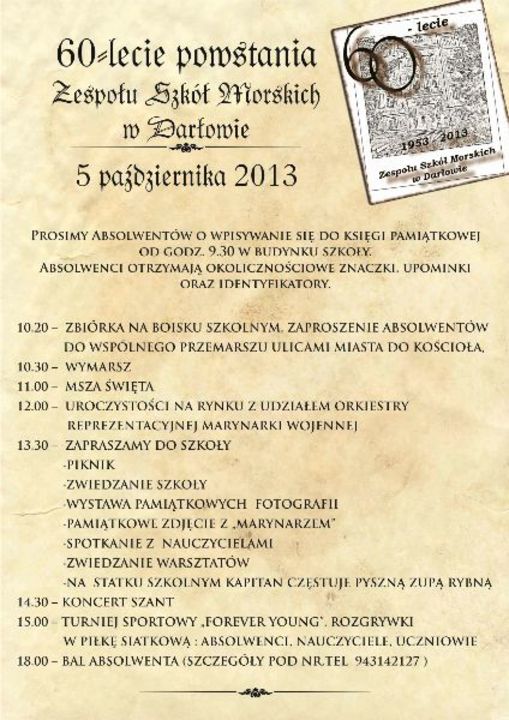 Zapraszamy! 60 lat Zespołu Szkół Morskich w Darłowie - 5 października 2013.