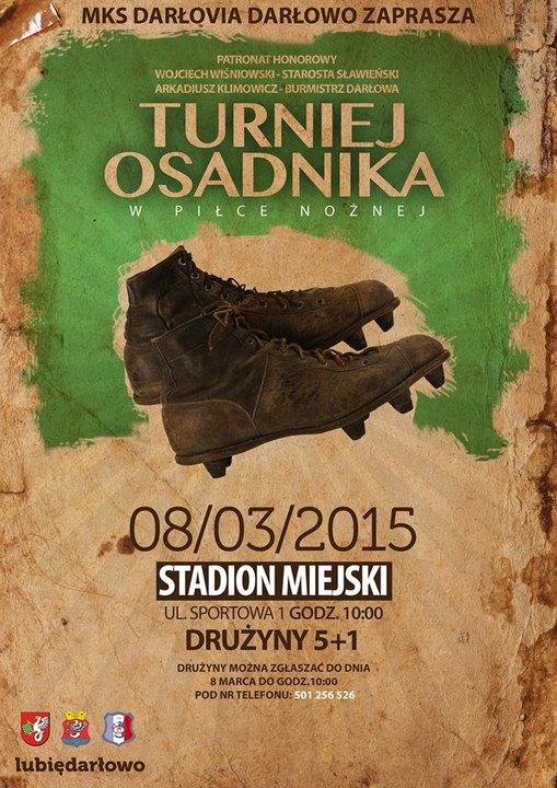 Już 8 marca br. o godz. 10:00 na Stadionie Miejskim przy ul. Sportowej 1 zostanie rozegrany turniej piłkarski poświęcony naszym pierwszym osadnikom. Oprócz rozgrywek zaplanowano również odegranie "Mazurka Dąbrowskiego" oraz przemówienie poświęcone pionierom. Patronat honorowy nad turniejem objęli Wojciech Wiśniowski - Starosta Sławieński i Arkadiusz Klimowicz Burmistrz Darłowa. Mecze odbywać się będą na dwóch specjalnie przygotowanych boiskach. Chętnych do wziecia udziału w tym sportowym wydarzeniu zapraszamy do zgłoszeń swoich zespołów w formacji 5+1 pod numerem telefonu 501256526 lub droga mailową turniej.osadnika@o2.pl. Zgłoszeń można dokonywać do dnia turnieju do godz. 10:00. Planowane zakończenie imprezy godz. 13:00.