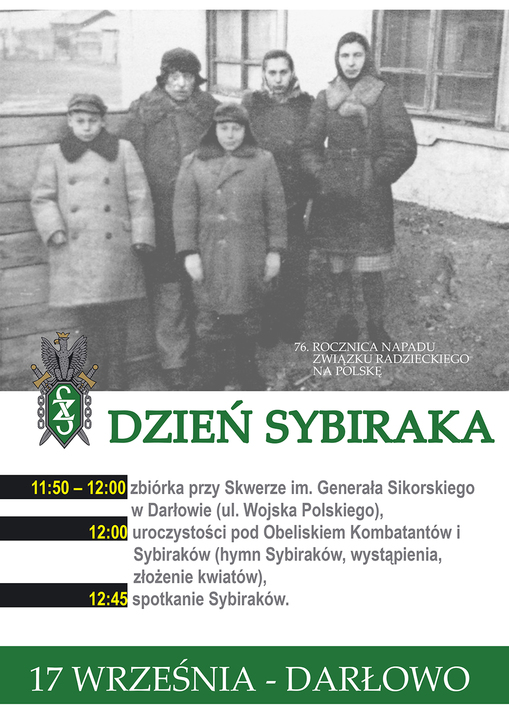 Związek Sybiraków - Koło w Darłowie oraz Miasto Darłowo zapraszają do udziału w oficjalnych obchodach 76. rocznicy napadu Związku Radzieckiego na Polskę. Dzień Sybiraka obchodzony będzie 17 września (tj. czwartek) w Darłowie (Skwer im. Generała Władysława Sikorskiego) zgodnie z poniższym harmonogramem: