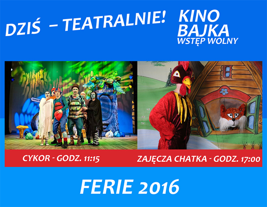 W dniu dzisiejszym, z okazji trwających ferii zimowych 2016, zapraszamy wszystkie dzieci na spotkanie z teatrem. Do południa w sali Kina Bajka w Darłowie aktorzy Bałtyckiego Teatru Dramatycznego z Koszalina zaprezentują znakomitą sztukę teatralną pn.: „Cykor - bojąca dusza" - (godz. 11:15). Po południu natomiast, zapraszamy również do kina gdzie zagrana zostanie „Zajęcza Chatka" w wykonaniu aktorów z Krakowa ze Studia Teatralnego ART-RE (godz. 17:00). Ponadto polecamy: pokaz magii i iluzji (DCW - g. 16:00) szybki kurs decoupage'u (DCW - g. 17:00), wszelakie zajęcia sportowe oraz warsztaty: modelarstwa i plastyczne, które odbywają się na Zamku w Darłowie. Szczegółowy program na www.darlowo.pl