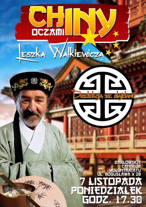 Dzisiaj, w poniedziałek 7 listopada zapraszamy na prelekcję pt "Chiny oczami Leszka Walkiewicza". To pierwsza część cyklu opowieści darłowskiego podróżnika, który tym razem wybrał się na daleki wschód. Spotkanie poświęcone Chinom odbędzie się o godz. 17.30 w siedzibie Darłowskiego Centrum Wolontariatu (ul. Bogusława X 28 - Dworzec PKP).