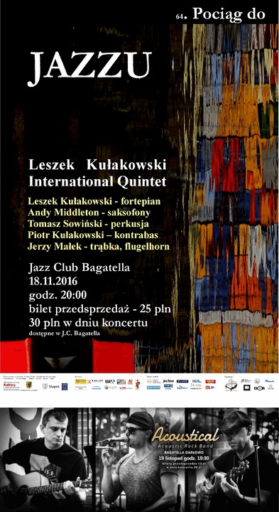 Muzycznie, a konkretniej mocno akustycznie będzie w ten weekend w Darłowie. To za sprawą 2 koncertów. Pierwszy z nich, dzisiejszy to już 64 edycja wydarzenia pn. Pociąg do Jazzu. Jutro zagra darłowska formacja Acoustical. Lokalizacja koncertów ta sama: Pizzeria / Pub Bagatella.