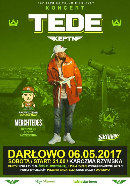 Nie tak dawno warszawski raper TEDE spotkał się z fanami w Darłowskim Centrum Wolontariatu, aby opowiedzieć o jego najnowszym albumie "KEPTN". Teraz zawita ponownie i przedstawi koncertowo swój album. Na zakończenie tzw. majówki (06.05.2017 - sobota) zapraszamy do Karczmy Rzymskiej. Całe wydarzenie poprowadzi Bonzay, czyli Daniel Frącz z Darłowa. Tutaj warto dodać, że darłowiak pod koniec marca oficjalnie dołączył do "stajni" artystów wytwórni muzycznej Wielkie Joł, której właścicielem i założycielem jest Jacek TEDE Graniecki. Nie zabraknie również wykonawców hip-hopowych z regionu. Koncert "KAPITANA" zaplanowano w późnych godzinach wieczornych. To będzie długa noc z najlepszymi muzycznymi liniami powietrznymi. Zapraszamy na pokład ! Projekt "Rap Piwnica" wciąż tętni życiem. Bilety można nabyć w lokalu Palisada Darłowo (ul. Powstańców Warszawskich 45).