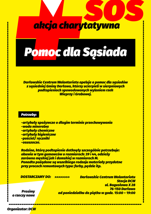 Darłowskie Centrum Wolontariatu apeluje o pomoc dla sąsiadów z sąsiedniej Gminy Darłowo, którzy ucierpieli w sierpniowych podtopieniach spowodowanych wylaniem rzek Wieprzy i Grabowej.
