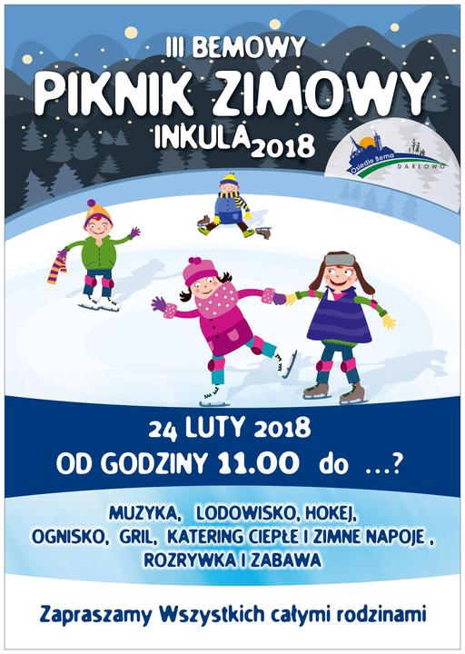 Rada Osiedla Bema zaprasza wszystkich mieszkańców na otwarty III Bemowy Piknik Zimowy - INKULA 2018. Odbędzie się on w sobotę, 24 lutego br. w godzinach 11:00 -17:00. W tym roku zabawa nad INKULĄ odbędzie się pod hasłem „W POSZUKIWANIU ZIMY" a w programie: ognisko, muzyka, zabawy zręcznościowe i jeżeli pogoda pozwoli to i harce na lodzie oraz iście piknikowy catering czyli; kiełbaski, karkówka itd. Proszę zabrać ze sobą znajomych, przyjaciół i dobry humor.