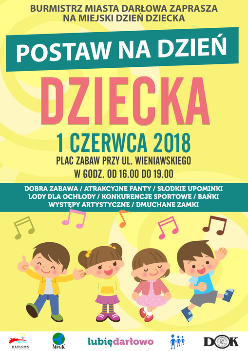 Burmistrz Darłowa Arkadiusz Klimowicz zaprasza wszystkie dzieci na Miejski Dzień Dziecka, który odbędzie się już w piątek - 1 czerwca 2018 roku, na Placu Zabaw przy ul. Wieniawskiego. Impreza odbędzie się w godzinach 16:00 - 19:00. Organizatorzy gwarantują: dobrą zabawę, atrakcyjne fanty, słodkie upominki, lody dla ochłody, konkurencje sportowe, występy artystyczne, bańki mydlane i dmuchane zamki. Zapraszamy.