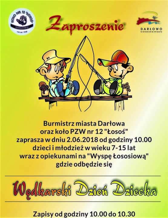 Burmistrz Darłowa oraz Koło PZW nr 12 Łosoś zapraszają dzieci w wieku 7-15 lat wraz z opiekunami na Wyspę Łososiową w Darłowie, gdzie 2 dnia czerwca br. w ramach obchodów Dnia Dziecka odbędzie się Wędkarski Dzień Dziecka. Zapisy od godz. 10:00 do 10:300 w dniu i miejscu wydarzenia.