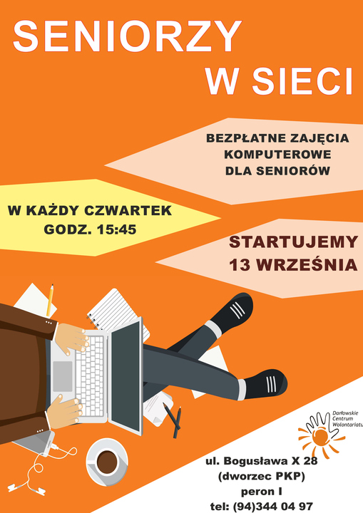 Darłowskie Centrum Wolontariatu zaprasza serdecznie wszystkich seniorów do udziału w bezpłatnych szkoleniach komputerowych, które odbywać się będą regularnie w każdy czwartek, o godz. 15:45 w siedzibie wolontariatu - tj. Darłowo, ul. Bogusława X 28. Rozpoczęcie - 13 września 2018.