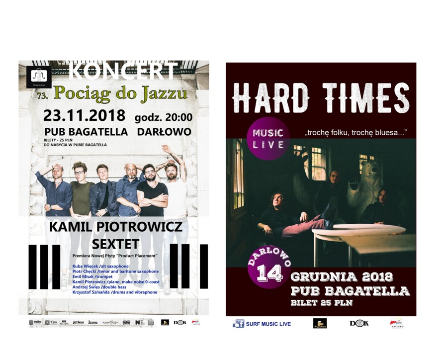 Pamiętacie Surf Music Live? Połączenia sportów wodnych, zamiłowania do fal i muzyki na żywo. Latem bawiliśmy się na deskach SUP, kajakach, żaglówkach, trickboardach, a wieczorem przy dźwiękach zespołu Kraków Street Band. Z racji pory roku nie każdy chętnie wskakuje do morza by poszaleć dlatego w jesienno-zimowej odsłonie imprezy proponuję Music Live czyli koncert zespołu HARD TIMES w składzie Marcin Hilarowicz gitara, cajon/ Łukasz Wiśniewski śpiew, harmonijka, ukulele / Piotr Grząślewicz gitara, irlandzkie buzuki. Na koncert zapraszam 14 grudnia do darłowskiej Bagatelli. Bilety - 25 pln w przedsprzedaży w Pubie.