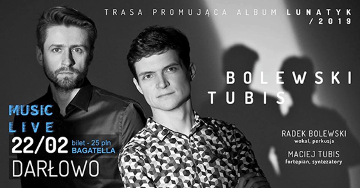 Darłowski Ośrodek Kultury im. L. Tyrmanda zapraszają w piątek 22 lutego 2019 roku o godz. 20:00 do darłowskiego pubu Bagatella, gdzie rozpocznie się koncert muzyczny Music Live Bolewski i Tubis. Autorekie piosenki połączone z odważnymi improwizacjami. Radosław Bolewski - perkusja i śpiew, Maciej Tubis - fortepian i syntezator basowy. Więcej o koncercie i muzykach - na wydarzeniu na FB (https://www.facebook.com/events/749637835404122/)