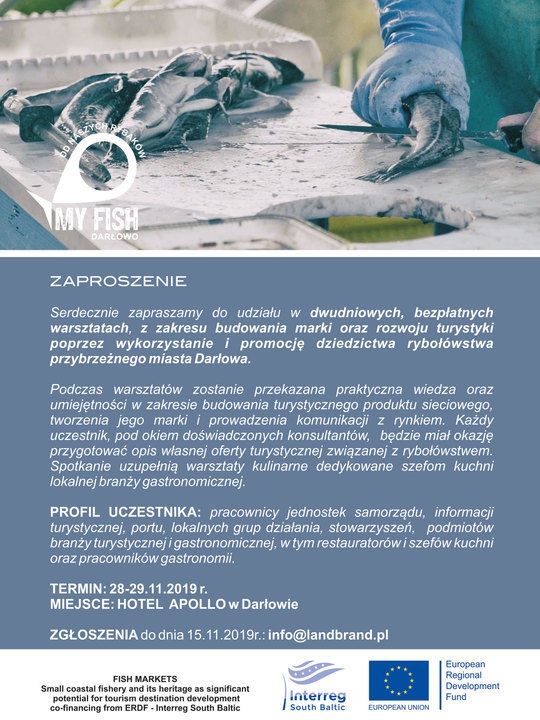 Serdecznie zapraszamy do udziału w dwudniowych, bezpłatnych warsztatach, z zakresu budowania marki oraz rozwoju turystyki poprzez wykorzystanie i promocję dziedzictwa rybołówstwa przybrzeżnego miasta Darłowa.