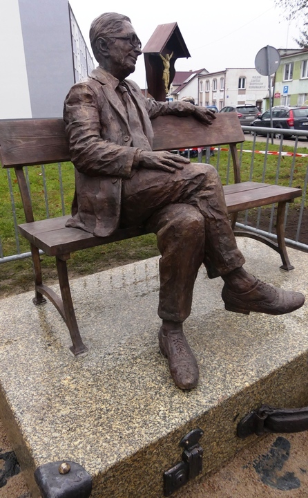 Postać Leopolda Tyrmanda w rogowych okularach zajmuje lewą stronę ławeczki, a na prawo od niej pozostało miejsce dla dwóch osób.