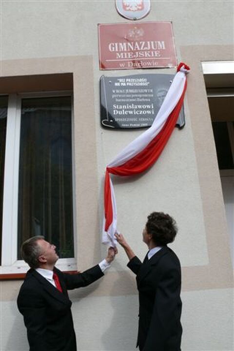 W piątek 2 października 2009 r. odbyła się uroczystość poświęcona 10. rocznicy utworzenia i funkcjonowania Miejskiego Gimnazjum im. Stanisława Dulewicza w Darłowie. Uroczystość rozpoczęła się Mszą Św. w Kościele Mariackim. Następnie burmistrz miasta Darłowa Arkadiusz Klimowicz razem z wnukiem pierwszego burmistrza Darłowa i patrona szkoły Stanisława Dulewicza odsłonili ufundowaną przez samorząd i umocowaną przy wejściu do szkoły tablicę pamiątkową. Na niej umieszczono słowa, które często powtarzał patron szkoły, również nauczyciel gimnazjalny: „Bez przeszłości niema przyszłości". Po poświęceniu tablicy przez proboszcza parafii M.B. Częstochowskiej dalszy ciąg uroczystości przebiegał w murach Gimnazjum.