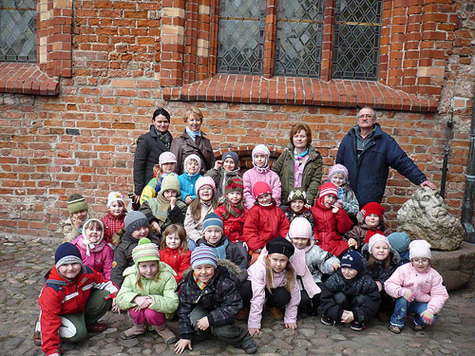Dzieci poznały już najważniejsze „darłowskie perełki" wymieniane medialnie we wszelkich materiałach promocyjnych naszego miasta. Ale pewnego dnia, tj. 19 marca 2010 r., za namową i uzgodnieniach pewnego przedszkolaka stawiliśmy się (grupa VIII i IX z Przedszkola Nr 2 wraz z wychowawcami: M. Knapińską i M. Werner ) do Zamku Książąt Pomorskich w Darłowie na spotkanie z jego wujkiem. Nauczyciele określają taką formę - spotkania z ciekawymi ludźmi. W murach starego zamku powitał wszystkich Konstanty Kontowski, historyk sztuki, z zamiłowania malarz i rysownik, autor wielu obrazów i rysunków o Darłowie. Pan Kontowski oprowadzając przedszkolaków po różnych zakątkach i salach zamkowych zwracał uwagę na przedmioty zgromadzone w poszczególnych salach. Dostępnym dla dziecka językiem opowiadał o byłych mieszkańcach darłowskiego zamku, jego historii i pięknych eksponatach muzealnych. Wzbogacił swoją opowieść o niektóre fakty z życia w naszym małym miasteczku. Spotkanie z „ciekawym" człowiekiem okazało się miłe i interesujące dla uczestników. Zapewne Zamek Książąt Pomorskich utknie w pamięci każdego dziecka, będzie przedmiotem fantastycznych przemyśleń i twórczych pomysłów. Dziecko z natury lubi przyglądać się wszystkiemu. Dlatego percepcja sztuki w atmosferze doznań emocjonalno estetycznych pozwala na rozbudzanie drzemiących w dziecku potrzeb poznawczych. Dzieci miały możliwość obcowania z dziełami sztuki swojego miasta, uzyskania odpowiedzi na nurtujące ich pytania od swojej pani z przedszkola oraz Pana Kontowskiego, więc cel został osiągnięty. Dzieci zaśpiewały piosenkę „Darłowo", której słowa ułożyła M. Knapińska, a na zakończenie zrobiono wspólną fotografię.