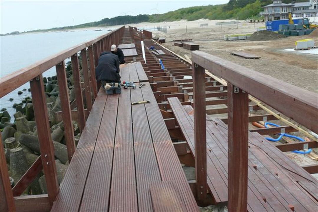 Na betonowym brzegowym falochronie na wschód od Latarni Morskiej trwa budowa dwupoziomowych pomostów spacerowych ze schodami i siedziskami. Promenada jest wykonywana z drzewa egzotycznego bangkirai. Ten gatunek bardzo twardego, odpornego na ścieranie i warunki atmosferyczne drewna rośnie w Indonezji, Malezji i Filipinach. Jego struktura jest tak zwarta, że rzucone do wody tonie. Promenada składa się z pomostu dolnego o długości 168 m i górnego o długości 156 m. Od strony morza na całej swej długości pomost jest zabezpieczony balustradą o wysokości 110 cm. Umożliwi on podziwianie nadmorskich widoków w szerokiej perspektywie i spacerowanie po szczycie falochronu. W pewnej części wyższy poziom pomostu będzie miał siedziska do opalania się. Na poszczególnych odcinkach falochron między poziomem pierwszym i drugim zabudowany będzie drewnianymi siedziskami, które na wysokości boiska do beach soccer i siatkówki plażowej wykorzystane mogą zostać jako trybuny dla widzów. Wejście i zejście na pomosty umożliwią drewniane schody.