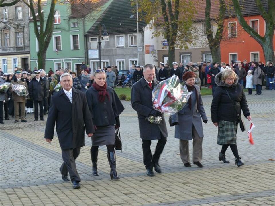 Z godnie z tradycją na cokole pomnika z cytatem z „Roty „ M. Konopnickiej „Nie Rzucim Ziemi Skąd Nasz Ród” delegacje złożyły wieńce i kwiaty. Wieniec od samorządu złożył burmistrz miasta w towarzystwie Zbigniewa Grosza – przewodniczącego rady Miejskiej i radnych.