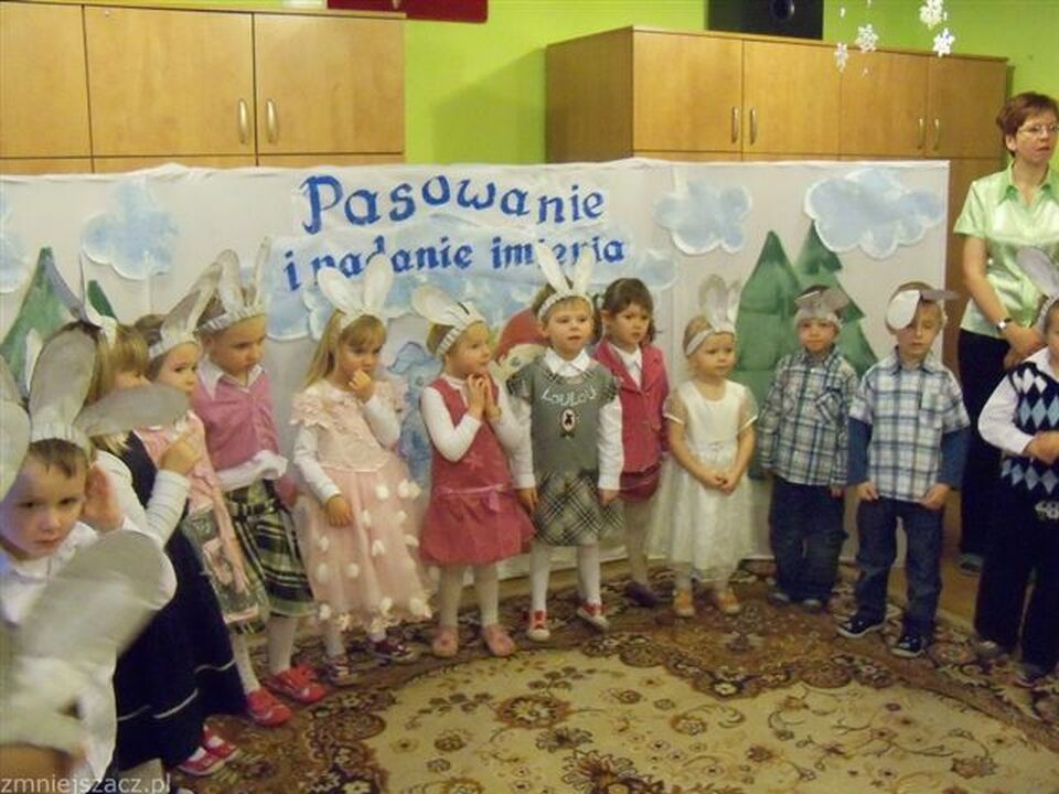 Tego dnia spotkały się dzieci z najmłodszej grupy, ich rodzice i nauczycielki. Pasowanie na Przedszkolaka symbolizuje przyjęcie malucha do społeczności przedszkolnej. Od wielu dni dzieci przygotowywały się do tego wydarzenia. Przedszkolaki zaśpiewały rodzicom piosenki, recytowały wiersze, prezentowały tańce, których nauczyły się do tej pory w przedszkolu. Pasowania olbrzymią kredką dokonała pani dyrektor Iwona Jaźwińska. Każdy przedszkolak otrzymał pamiątkowy dyplom, oraz drobny upominek. Tego samego dnia dzieci 4 i 5 letnie otrzymały imię dla swojej grupy i od tej pory będą nazywać się „Zajączkami". Jednocześnie dokonano również aktu pasowania na przedszkolaka wychowanków uczęszczających do przedszkola od obecnego roku szkolnego.