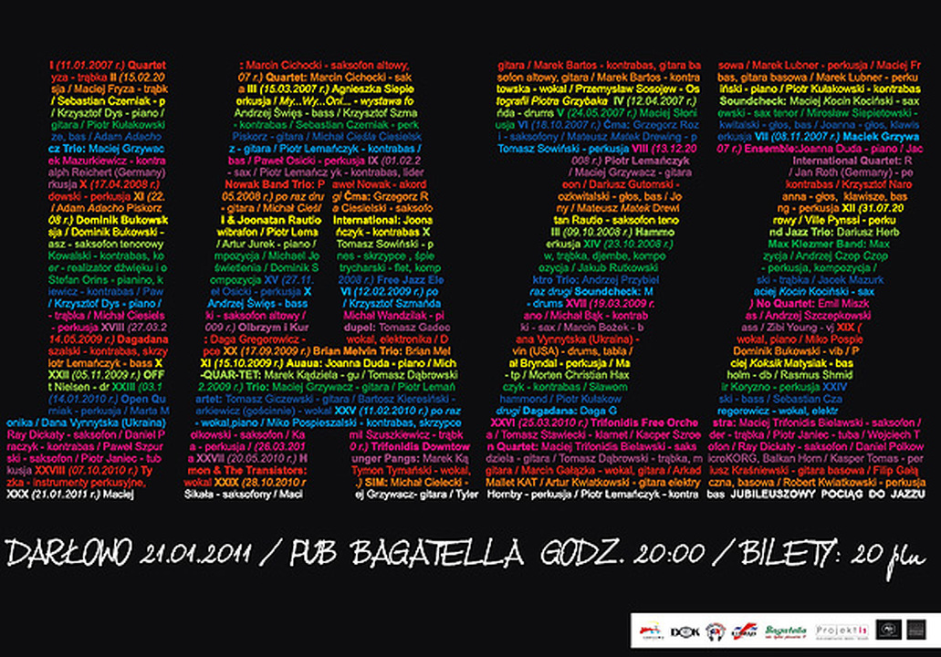 W styczniu mija czwarty rok trwania inicjatywy pod nazwa Czwartkowy Pociąg do Jazzu. Zaczęło się od koncertu 11 stycznia 2007 roku, kiedy czwórka darłowskich muzyków - Maciek Fryza, Marek Lubner, Marcin Cichocki oraz Marek Bartos pierwszymi dźwiękami w piwnicy Pubu Bagatella powołali do życia cykl jazzowych koncertów. Ruszył „Pociąg do Jazzu". Kolejne koncerty jak doczepiane „wagony" prezentowały coraz to nowe składy muzyków i gościły podróżujących słuchaczy. Przez 4 lata odbyło się 29 koncertów z czego 6 to grupy międzynarodowe, w których grali muzycy z różnych zakątków europy jak również ameryki. O tym, że grają jazz w Darłowie jest już głośno, mówiono o tym m.in. w Drugim Programie Polskiego Radia. Wieść tą szerzą muzycy odwiedzający piwnice Bagatelli jak również ludzie, którzy czasem przyjeżdżają z okolicznych miast na koncerty. Klimat CZ.P.d.J. tworzą przede wszystkim słuchacze, w następnej kolejności muzycy oraz miejsce, które niewątpliwie się przyjęło. Pub Bagatella udostępnia Pan Dariusz Kos, który pomaga w organizacji koncertów, a także zapowiada grające zespoły.