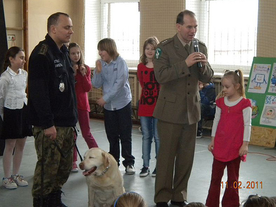 Po zakończeniu „rozprawy", odbyła się kolejna część apelu, na którą zaproszono gości specjalnych - przedstawicieli ze Straży Granicznej w Darłowie. Pan Marcin Kruszczyński zaprezentował klasom IV-VI oraz I-III problematykę zagrożeń czyhających podczas zimowych zabaw. Prosił o rozważne korzystanie z uroków zimy. Dla uczniów Trójki zaproszeni goście przygotowali także miłą niespodziankę w postaci uroczego labradora, który był nie lada atrakcją dla wszystkich widzów. Panowie poinformowali jak należy zachowywać się w stosunku do nieznanego nam psa. Tu również prosili o ostrożność.