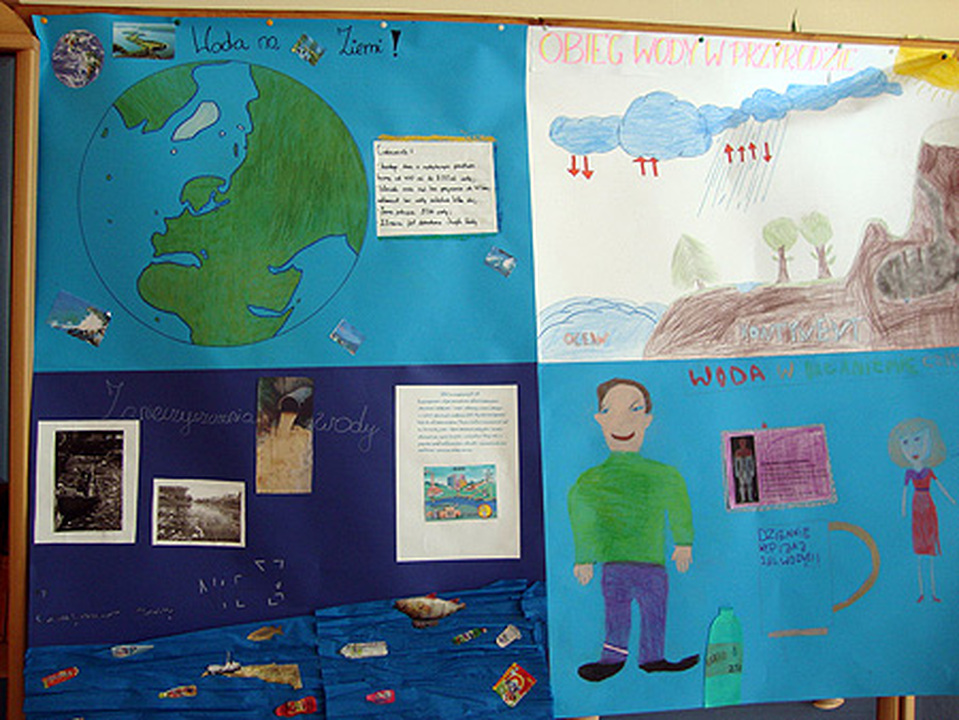 W naszej szkole odbył się konkurs dla klas IV - VI na przygotowanie ekologicznej gazetki ściennej. Uczniowie mieli dwa tygodnie na skompletowanie materiałów i opracowanie koncepcji wspólnej pracy. Tematem przewodnim były żywioły. Klasy IV prezentowały wodę, klasy V ziemię, a VI powietrze. Jak zwykle wyobraźnia uczniów pokazała ich nieograniczone możliwości i zaskakujące rozwiązania. Organizatorki, a jednocześnie jurorki konkursu - Monika Kosowska i Barbara Kalinowska - opracowały kryteria oceny, w których główny nacisk położono na wkład własny dzieci i wysiłek, jakiego wymagało wykonanie danej gazetki. Przy ocenie brano pod uwagę zgodność z tematem, oryginalność pomysłu, estetykę oraz sposób wykonania. 15 kwietnia komisja obejrzała wszystkie przygotowane prace i dokonała niełatwej oceny, która przedstawiała się następująco: