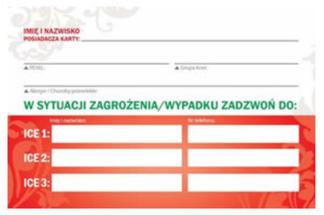 Skrót ICE (In Case of Emergency) oznacza „w nagłym wypadku". Pomysł kart ICE powstał z inicjatywy włoskich ratowników, którzy zauważyli lukę informacyjną w kontakcie z rodziną i bliskimi poszkodowanych. W sytuacji wypadku czy innego zagrożenia nasi bliscy często nie wiedzą, co się wydarzyło i gdzie się znajdujemy. Dlatego warto mieć zapisanych kilka ważnych informacji na karcie ICE. Jest to trwała, plastikowa karta wielkością przypominająca zwykłą kartę płatniczą, z imieniem i nazwiskiem właściciela oraz 3 numerami do naszych najbliższych osób, które należy powiadomić w razie wypadku. Osoby podane do kontaktu powinny umieć udzielić informacji o stanie zdrowia właściciela karty.