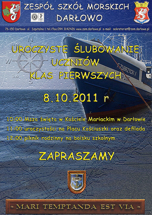 Zespół Szkół Morskich w Darłowie zaprasza na uroczyste ślubowanie uczniów klas pierwszych, które odbędzie się 8 października 2011 roku (tj. sobota) w Darłowie zgodnie z poniższym harmonogramem: