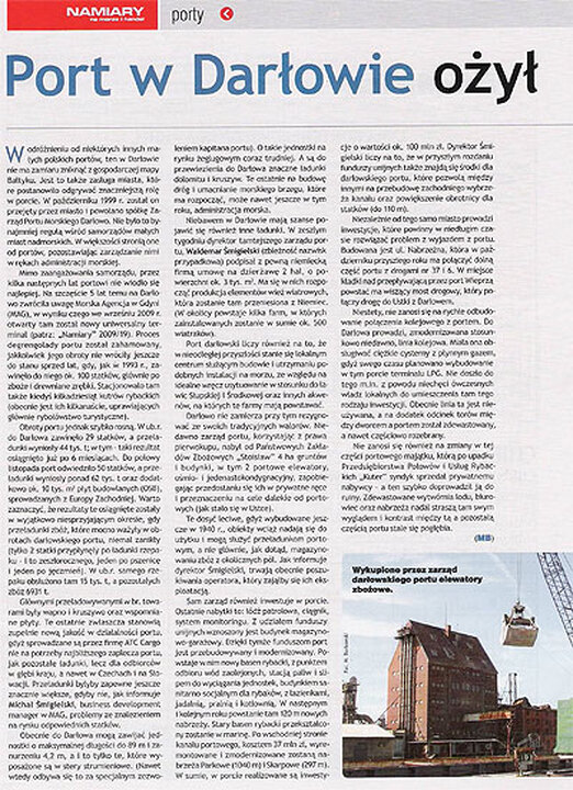 Mimo zaangażowania samorządu, przez kilka następnych lat portowi nie wiodło się najlepiej. Na szczęście 5 lat temu na Darłowo zwróciła uwagę Morska Agencja w Gdyni (MAG), w wyniku czego we wrześniu 2009 r. otwarty tam został uniwersalny terminal (patrz: „Namiary" 2009/19). Proces degrengolady portu został zahamowany, jakkolwiek jego obroty nie wróciły jeszcze do stanu sprzed lat, gdy, jak w 1993 r., zawinęło do niego ok. 100 statków, głównie po zboże i drewniane zrębki. Stacjonowało tam także kiedyś kilkadziesiąt kutrów rybackich (obecnie jest ich kilkanaście, uprawiających głównie rybołówstwo turystyczne).