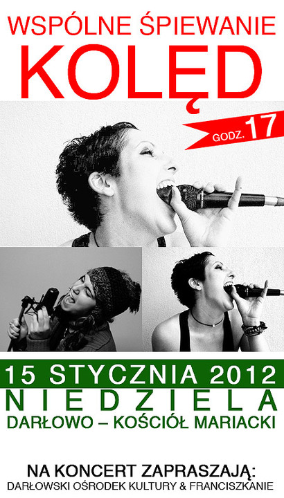 Darłowski Ośrodek Kultury wraz z Franciszkanami serdecznie zapraszają mieszkańców Darłowa i okolicy do wspólnego śpiewania kolęd. Koncert najpiękniejszych świątecznych melodii odbędzie się w najbliższą niedzielę tj. 15 stycznia 2012 roku o godzinie 17:00 w Kościele Mariackim w Darłowie.