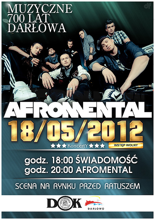 Piątek (18 maja) na rynku przed ratuszem o godzinie 18:00 usłyszymy nasz rodzimy zespół Świadomość z muzyką reggae w repertuarze a tuż po niej koncert dla mieszkańców Darłowa i wszystkich przybyłych gości da znany polski zespół grający muzykę z pogranicza funk, reggae, R&B, hip-hopu i soul - AFROMENTAL.