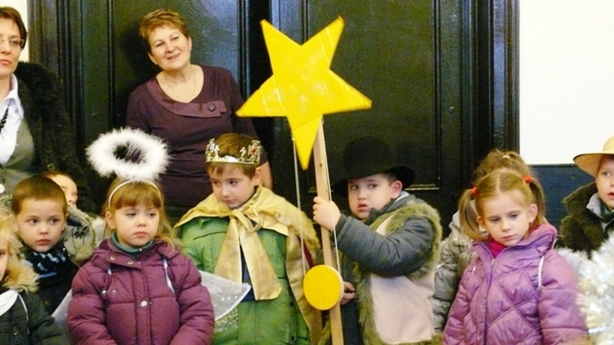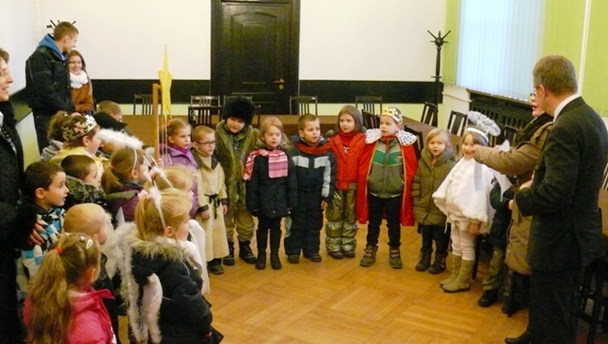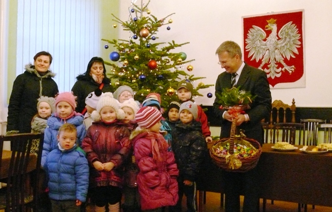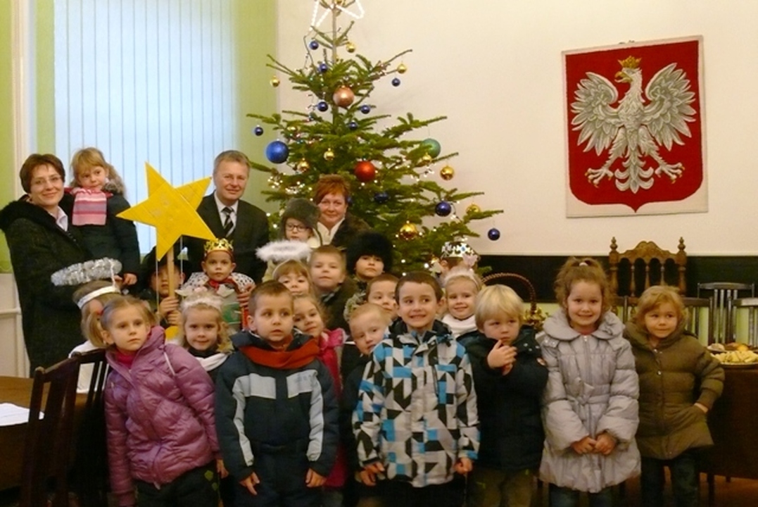 Gwar dziecięcych głosów i tupot małych nóżek – takie dźwięki wypełniły w dniu dzisiejszym Urząd Miejski w Darłowie. W sali konferencyjnej darłowskiego ratusza grupa integracyjna z samorządowego Przedszkola nr 2 im. Janiny Porazińskiej złożyła włodarzowi miasta życzenia od dzieci i pracowników Przedszkola. Życzono spełnienia marzeń i realizacji zamierzeń dla dobra mieszkańców miasta. Dzieciaki wręczyły burmistrzowi własnoręcznie wykonany stroik. Pod choinką częstowano maluchy i wychowawczynie słodyczami. Druga grupa przybyła z Niepublicznego Przedszkola „Jacek I Agatka”. Dzieciaki poprzebierane w aniołki, gwiazdorów, pasterzy, Trzech Króli, a nawet za diabełka śpiewały kolędy, recytowały wiersze i życzenia, a gwiazda kręciła młynka niczym wiatrak. Dzieciaki złożyły własnoręcznie wykonane kartki świąteczne i stroiki. Na koniec wizyty wszyscy zrobili sobie pamiątkowe zdjęcie pod rozświetloną choinką. Burmistrz w odpowiedzi niczym Św. Mikołaj obdarował maluchy słodkimi ciastkami i cukierkami.