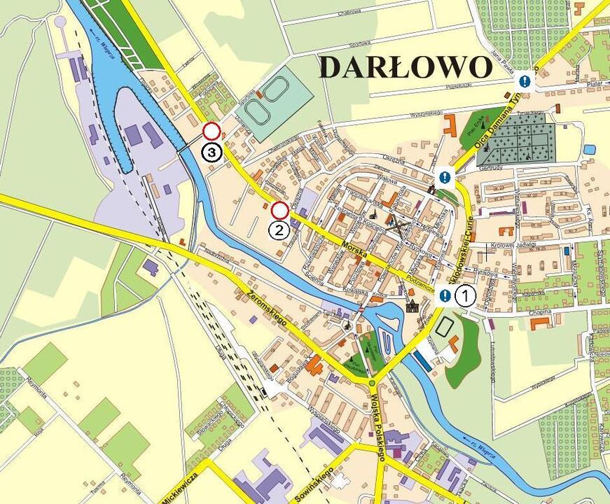 Na fragmencie planu miasta zaznaczono 1- rondo na skrzyżowaniu ul. M.C. Skłodowskiej, 2 skrzyżowanie ul Morskiej i Okrężnej, 3 Rondo w budowie na skrzyżowaniu ulic Morskiej i SportowejL. Walkiewicz