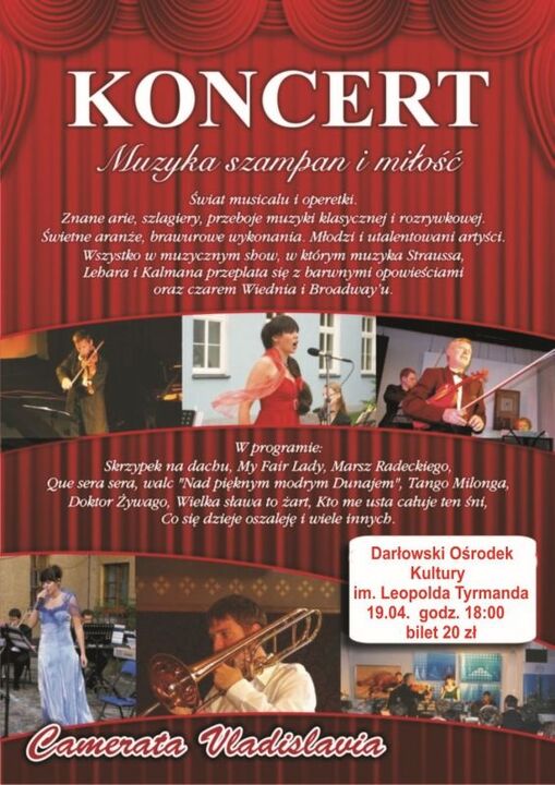 Już dziś o godzinie 18:00 koncert pt.: „Muzyka, szampan i miłość" - świat musicali i operetki Camarata. Gratka dla miłośników opery i operetki. Muzycy z Cameraty Vladislavia zaprezentują znane arie i szlagiery muzyki klasycznej i rozrywkowej. Świat musicalu i operetki. Świetne aranże, brawurowe wykonania. Utalentowani artyści. Wszystko to w muzycznym show, w którym muzyka Straussa, Lehara i Kalmana przeplata się z barwnymi opowieściami oraz czarem Wiednia i Broadway'u.Wystąpią Camerata Vladislavia oraz soliści: Emila Zielińska (sopran) i Łukasz Załęski (tenor). W programie „Skrzypek na dachu", „My Fair Lady", „Marsz Radeckiego", „Que sera, sera", „Nad pięknym modrym Dunajem", „Tango Milonga", „Co się dzieje, oszaleję" i wiele innych.