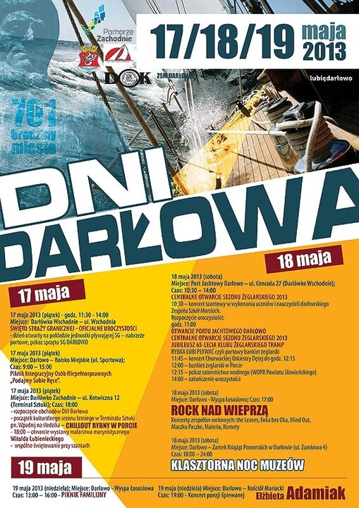 Dwudniowe świętowanie 701 urodzin naszego miasta odbywac się będzie w dniach od 17 do 19 maja. Jest w czym wybierać, gdyż Miasto Darłowo przygotowało wiele propozycji na spędzenie wolnego czasu.
