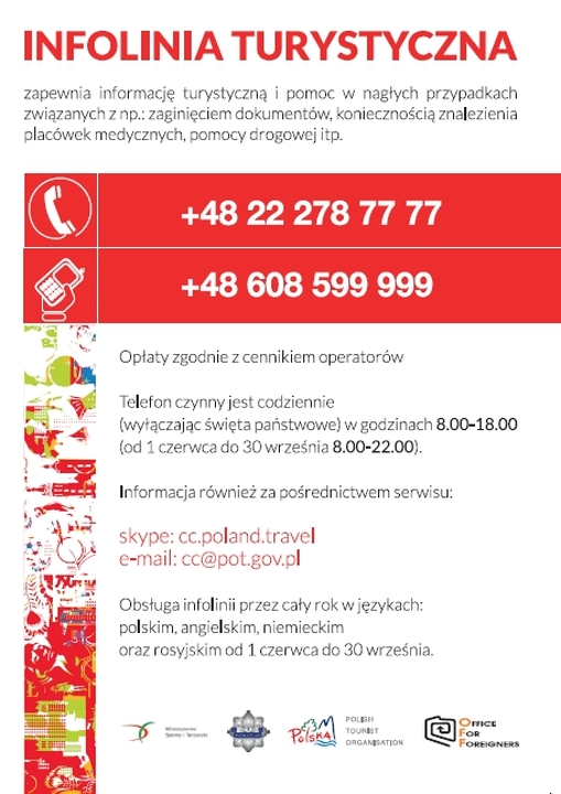 1 czerwca rusza Telefon Bezpieczeństwa dla turystów, który w tym roku został po raz pierwszy zintegrowany z Polskim Systemem Informacji Turystycznej. W godzinach 8-22, od 1 czerwca do 30 września, do dyspozycji turystów zagranicznych będzie Contact Center, w którym w razie potrzeby będzie można uzyskać zarówno pomoc w nagłych sytuacjach (np. zagubienia paszportu), jak i wszelkie informacje dotyczące atrakcji turystycznych, noclegów, etc.