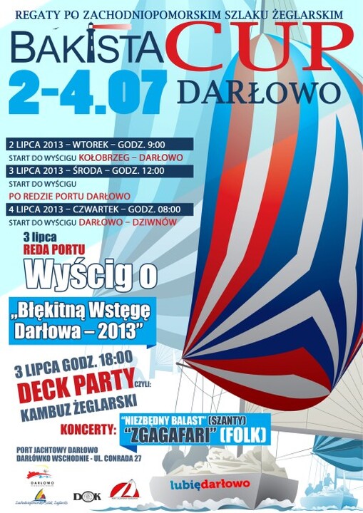 Już za tydzień w dniach 2 - 4 lipca w darłowskim porcie będzie miało miejsce żeglarskie wydarzenie. Mowa o zapowiadanych wcześniej Regatach po Zachodniopomorskim Szlaku Żeglarskim - Bakista CUP, których pomysłodawcą i organizatorem jest znany 'Żeglarskiej Braci' - Piotr Stelmarczyk. Organizator wielu imprez mających na celu propagowanie żeglarstwa po wodach Bałtyku. W godzinach popołudniowych 2 lipca - do darłowskiego portu wpłyną jachty biorące udział w regatach, które tego dnia ścigać się będą na dystansie pomiędzy portami Kołobrzeg - Darłowo. Szczególnie widowiskowo zapowiada się wyścig po redzie Portu Morskiego - Darłowo. 3 lipca rozpocznie się on w samo południe i będzie go można obserwować zarówno z falochronów portowych jak i samej plaży. Pozwoli to Turystom i mieszkańcom aktywnie kibicować zawodnikom, którzy zabiegać będą o pomyślne wiatry dla swoich załóg. Załogi te rywalizować będą o „Błękitną Wstęgę Darłowa - 2013" - nagrodę Burmistrza Darłowa dla jachtu żeglarskiego, który w najkrótszym czasie pokona wyznaczoną trasę w morskim wyścigu na Redzie Portu Darłowo. W godzinach wieczornych (od 18:00) zapraszamy na uroczyste podsumowanie i dekorację Zwycięzców etapu darłowskiego Bakista Cup -Regat po Zachodniopomorskim Szlaku Żeglarskim. Odbędzie się ono w Porcie Jachtowym w Darłówku Wschodnim przy ul. Conrada 27 (Marina). W programie: