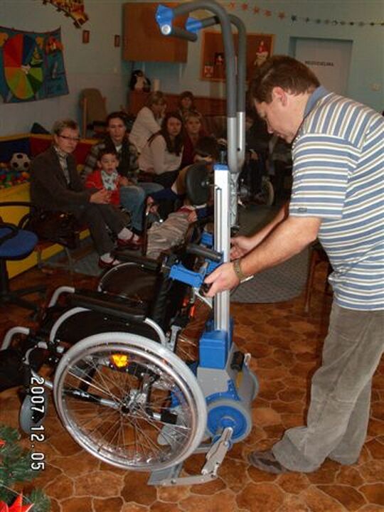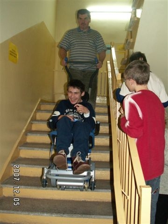 Licznie zgromadzeni rodzice i opiekunowie osób niepełnosprawnych, nauczyciele, rehabilitanci mogli dokładnie przyjrzeć się bogatej ofercie firmy. Przedstawiono dokładnie zasady działania podnośników i krzesełek dźwigowych. Wyjaśniano możliwości ich instalacji w warunkach domowych. Po raz pierwszy w życiu naprawdę potrzebowaliśmy schodów, tej codziennej bariery architektonicznej dla niepełnosprawnych ruchowo, aby dokładnie zobaczyć funkcjonowanie schodołazów, a akurat nas w Ośrodku schodów jak na lekarstwo ;-). Na szczęście udało się je znaleźć po sąsiedzku. Doradzano, jak dobrać odpowiedni wózek dla dzieci i dorosłych, jak można go dostosować do indywidualnych wymagań. Pokazano, że dzięki podnośnikowi wannowemu można komfortowo i bezpiecznie zażywać kąpieli i nie sprawiać kłopotu opiekunom podczas wychodzenia z wanny.