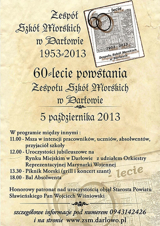 Zespół Szkół Morskich w Darłowie w tym roku obchodzi Jubileusz 60 - lecia swojego powstania. Z okazji okrągłych Urodzin najstarszej w Polsce szkoły średniej, kształcącej przyszłą kadrę Ludzi Morza, w dniu 5 października odbędą się uroczyste obchody tego święta. W programie m.in.: