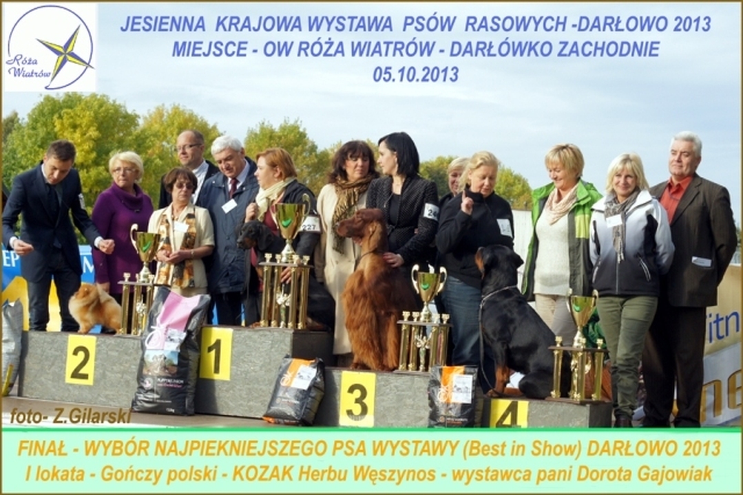 W wystawie wzięło udział 400 psów reprezentujących ponad sto ras. Byli równiez wystawcy z Niemiec, Ausstralii i Tajlandii. Przygotowania do organizacji tak okazałej wystawy trwały ponad pół roku mówił-międzynarodowy sędzia kynologiczny-Zbigniew Gilarski - główny organizator tej Krajowej Wystawy. To dzięki niemu i jego inicjatywie ta wystawa odbyła się w Darłowie. Komitetem organizacyjnym kierowała Dorota Jakubowska, a komisarzem wystawy była Bożena Więckowska – Sieńko. Wystawcom i widzom dopisała pogoda. W naturalnym otoczeniu dobrze czuły się psy. Konkurencję finałową, czyli Best In show-DARŁOWO 2013, wygrał doskonały anatomicznie i dobrze wyszkolony pies rasy gończy polski o nazwie KOZAK Herbu Węszynos, wystawca - Dorota Gajowiak. Drugą lokatę zdobył szpic miniaturowy (Pomeranian). Trzecie miejsce wywalczył dobrze zbudowany seter irlandzki ARGO Rysi Wykrot. Na zakończenie ze wszech miar udanej wystawy puchary i nagrody wręczali osobiście Wojciech Wiśniowski-starosta powiatu sławieńskiego i Krzysztof Walków – sekretarz Urzędu Miejskiego w Darłowie. Organizatory serdecznie dziękują samorządowi powiatu sławieńskiego i miasta Darłowa, wolontariuszom z Darłowskiego Centrum Wolontariatu, a szczególnie Henrykowi Uklei za gościnę, sponsorowanie i pomoc w organizacji wystawy.