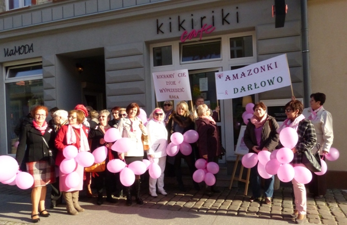 Ubrane na różowo z różowymi wstążeczkami i takiego samego koloru balonikami 25 października zebrały się na darłowskim rynku po Rybakiem darłowskie Amazonki, które w ten sposób przypomniały społeczeństwu, że październik to miesiąc świadomości raka piersi. Rak piersi jest najczęściej występującym nowotworem złośliwym u kobiet. Co roku ok. 14 tys. Polek dowiaduje się, że są chore na raka piersi. Znanych jest kilka typów tego nowotworu. Każdy z tych nowotworów jest inny. Wiedzę o typie raka piersi, na jaki choruje kobieta, jest kluczowa dla wyboru odpowiedniego leczenia oraz zwiększa szanse a wyleczenie. Różowe wstążeczki są znakiem poparcia dla kampanii „Przyjaciele od Piersi” i symbolem walki z ta chorobą. Z pod ratusza Amazonki przeszły ulicą Powstańców Warszawskich i następnie udały się do kawiarni "Kiki riki".