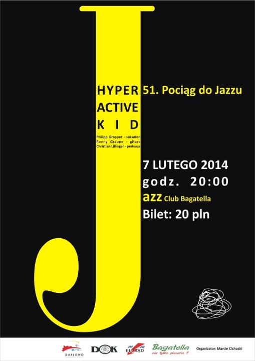 Już dzisiaj, 07.02.2014r. o 20:00, w darłowskim jazz klubie Bagatella odbędzie się 51. Pociąg do Jazzu. Na jedynym tego typu koncercie w Polsce, w trakcie europejskiej trasy koncertowej, wystąpi zespół Hyperactive Kid. Od 2003 roku tworzą go: perkusista, kompozytor Christian Lillinger, saksofonista tenorowy i sopranowy, kompozytor Philipp Gropper i gitarzysta, kompozytor Ronny Graupe.