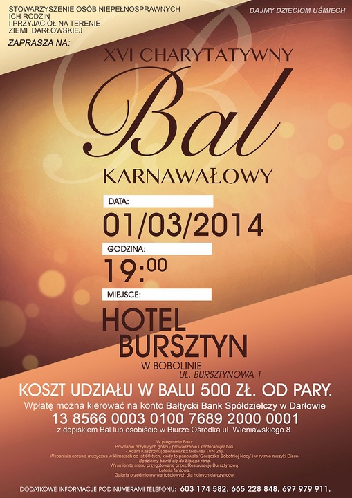 Zarząd Stowarzyszenia Osób Niepełnosprawnych w Darłowie serdecznie zaprasza na XVI Bal Charytatywny, który odbędzie się 1 marca 2014 roku w Centrum Rehabilitacyjnym SPA & WELLNESS „BURSZTYN" Halina Ślepko w Bobolinie (ul. Bursztynowa 1). Bal rozpocznie się o godzinie 19.