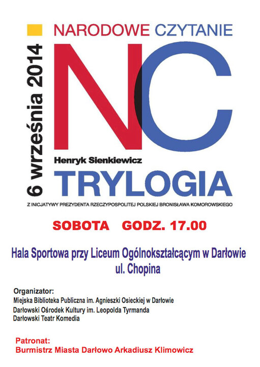 Mieszkańców Darłowa i wszystkich zainteresowanych zapraszamy do udziału w Narodowym Czytaniu „Trylogii' Henryka Sienkiewicza. Zaczynamy o godzinie 17:00 - 6 września br. (tj. sobota) w nowej hali sportowej przy Liceum Ogólnokształcącym im. Stefana Żeromskiego w Darłowie (ul. Chopina).